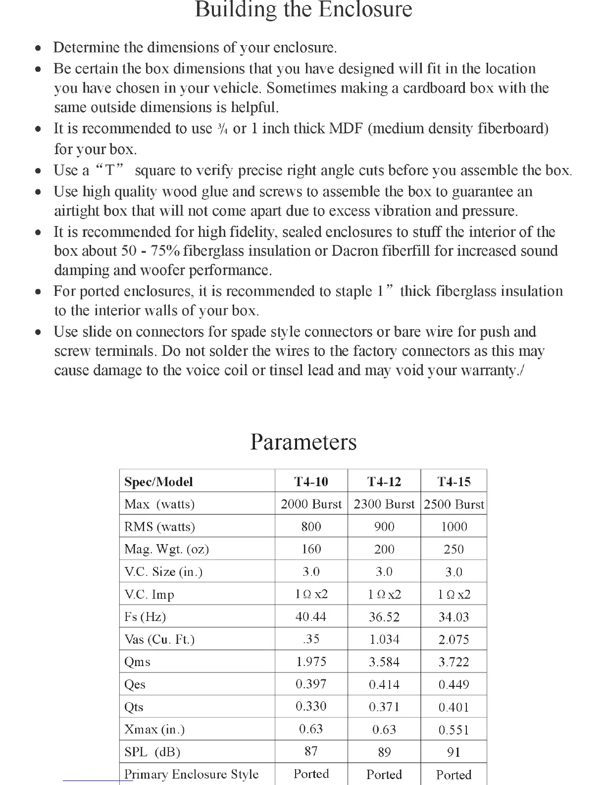 Soundstream T4-10 - Building the Enclosure; Parameters