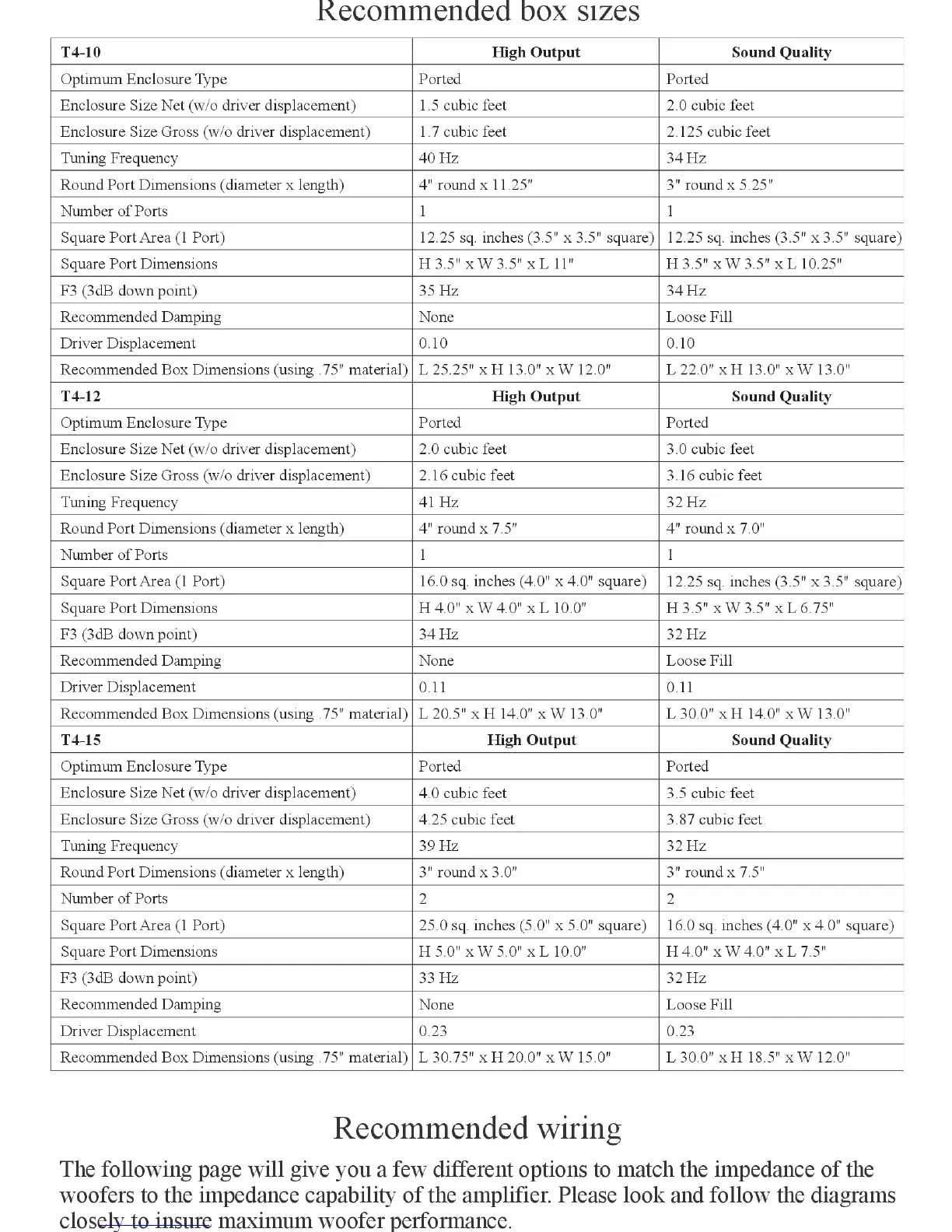 Soundstream T4-10 - Recommended Box Sizes; Recommended Wiring