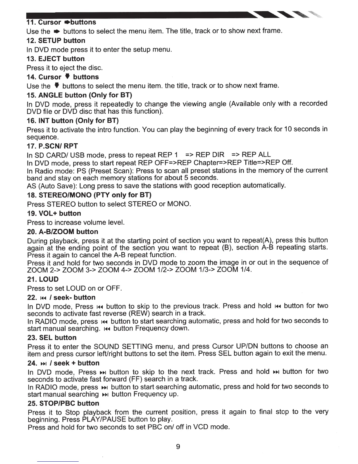 DVD mode, press to start repeat REP OFF=>REP Chapter=>REP Title=>REP