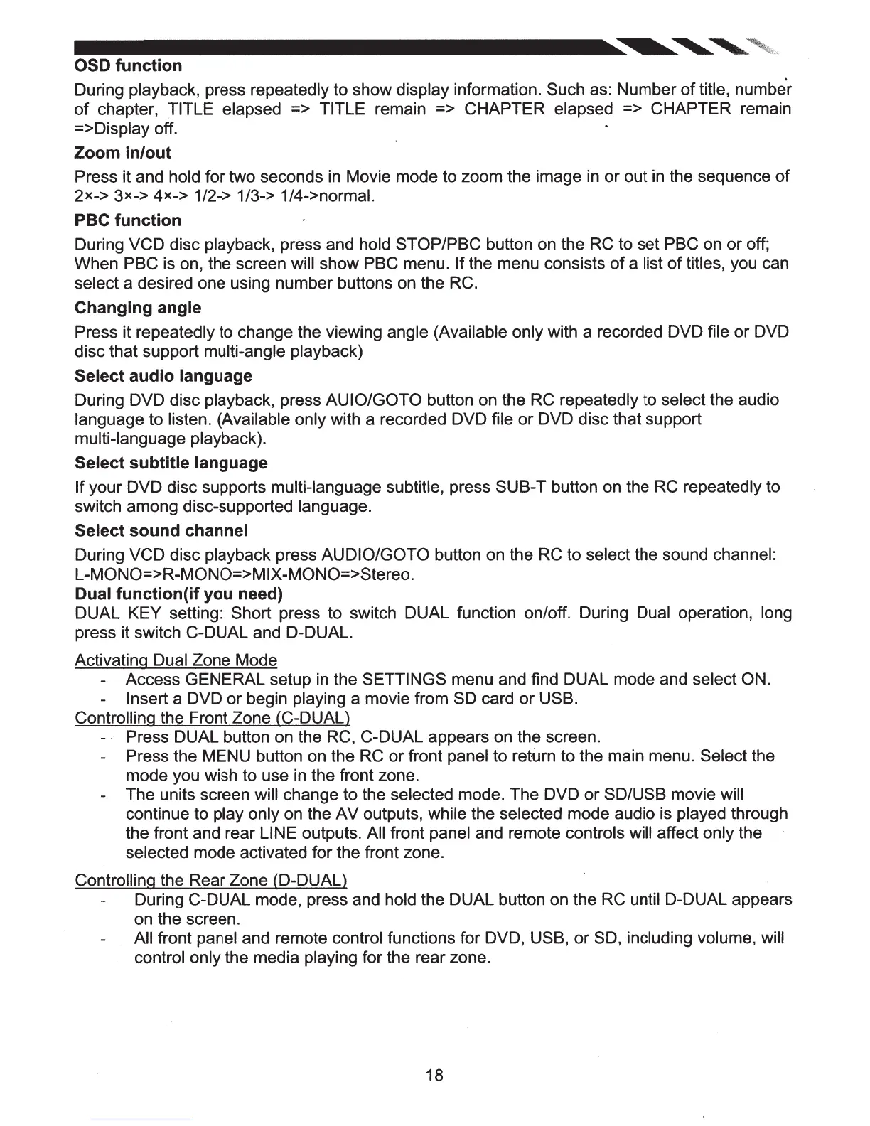 During VCD disc playback, press and hold STOP/PBC button on the RC to set PBC on or off;