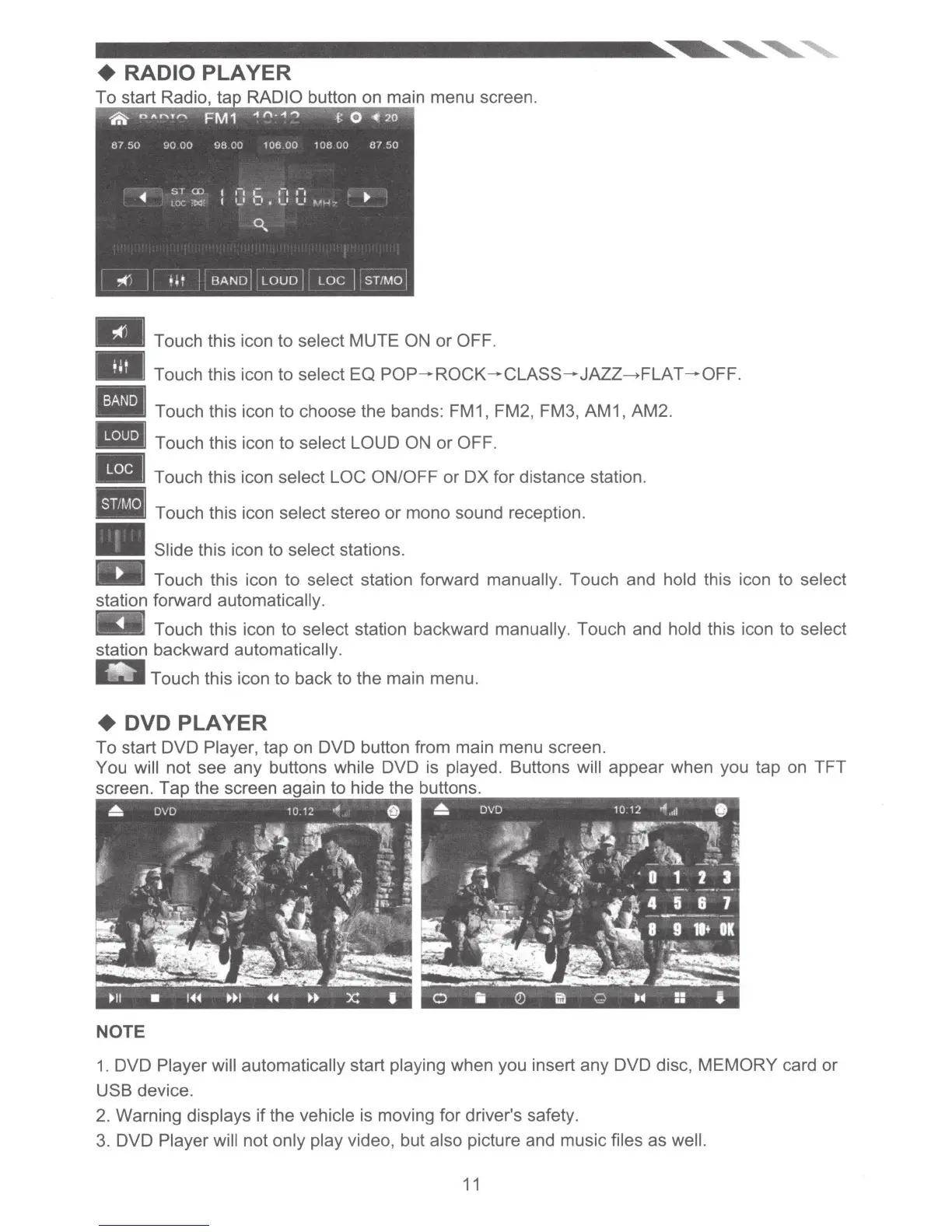 Touch this icon to choose the bands: FM1, FM2, FM3, AM1, AM2.