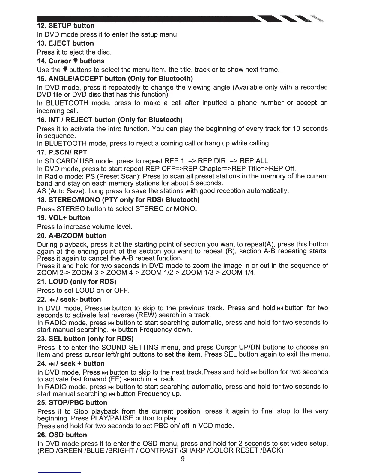 DVD mode, press to start repeat REP OFF=>REP Chapter=>REP Title=>REP Off.