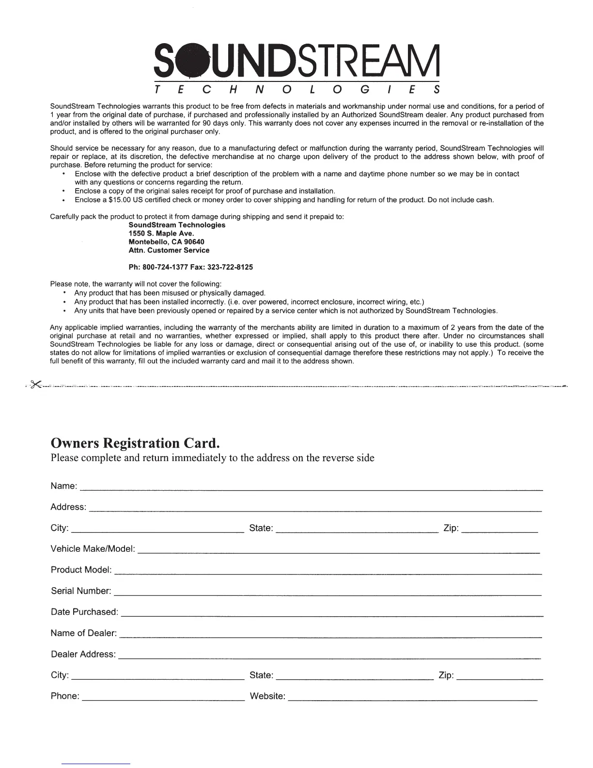 SoundStream Technologies warrants this product to be free from defects in materials and workmanship under normal use and conditions, for a period
