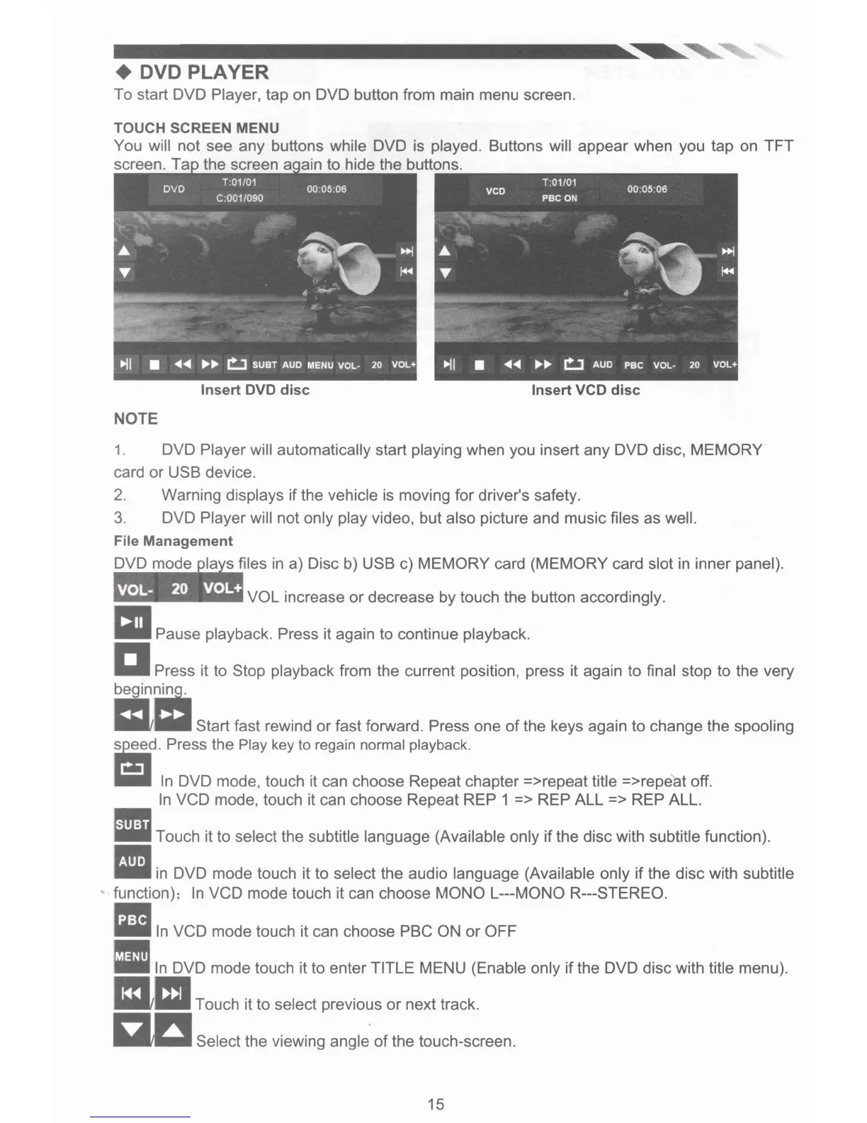 DVD mode touch it to enter TITLE MENU (Enable only if the DVD disc with title menu).