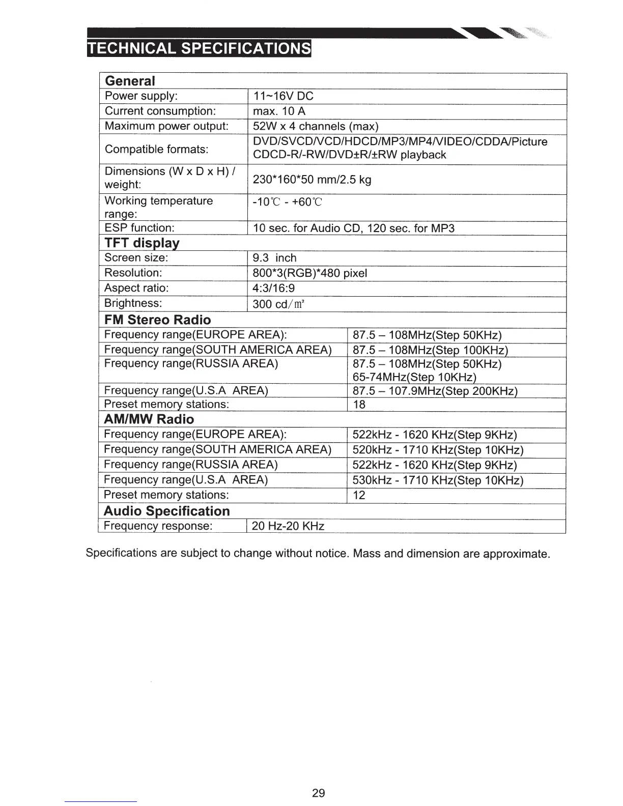 Specifications are subject to change without notice. Mass and dimension are