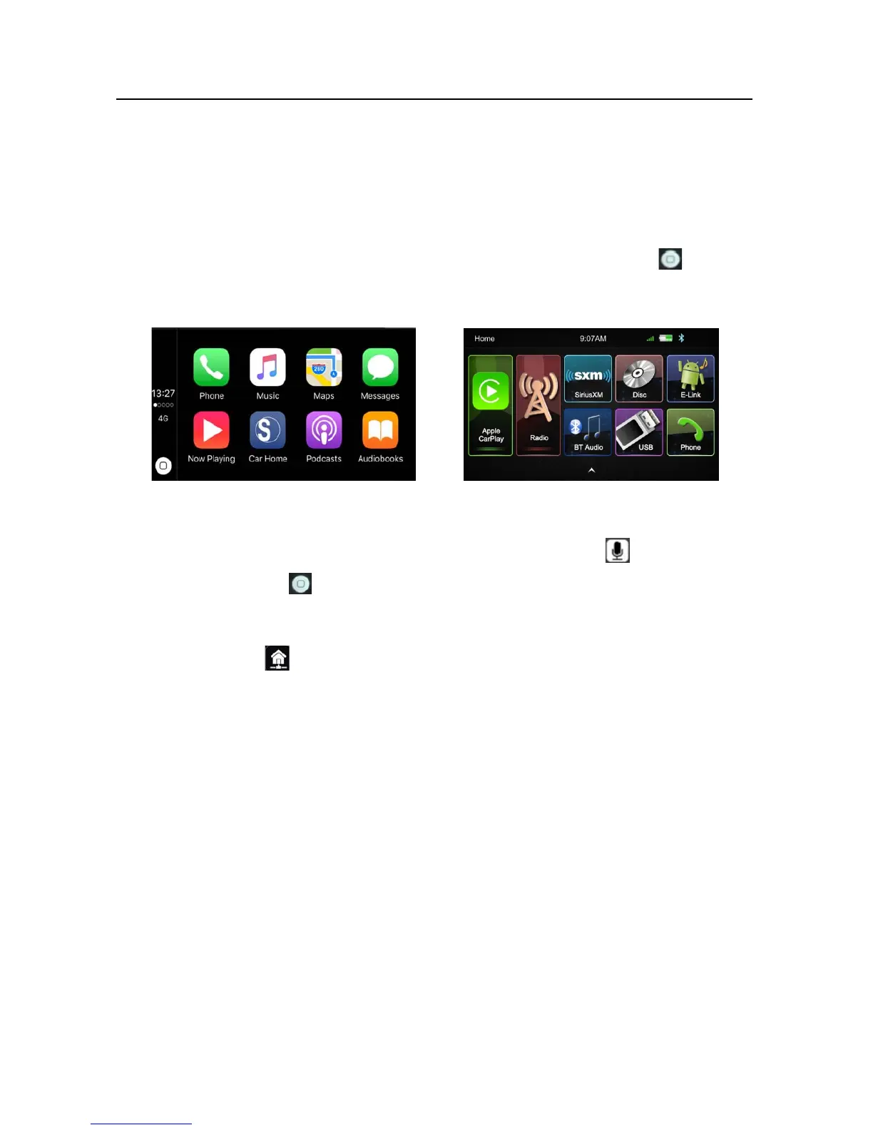 SIRI function, or touch thebutton for 2 second or the HOME buttonof iPhone inthe CarPlay