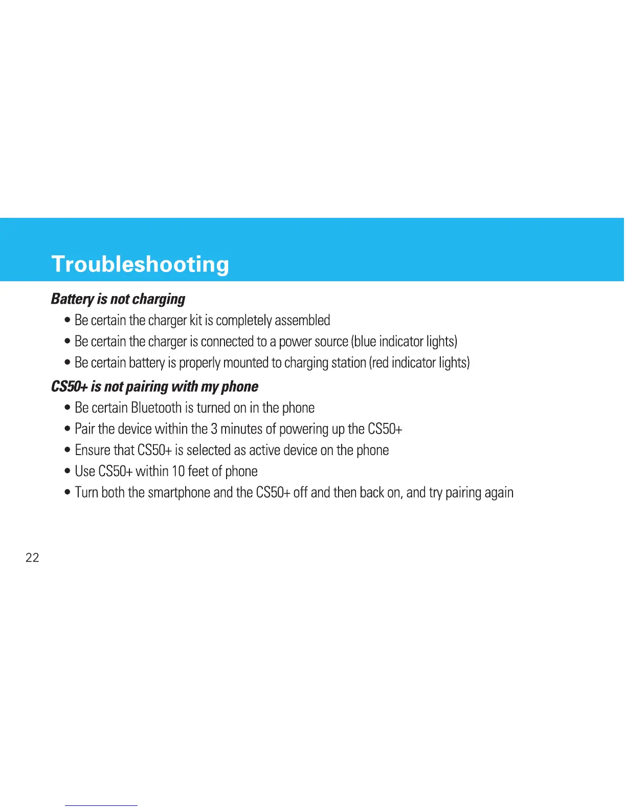 Soundworld CS50+ - Troubleshooting; Battery is not charging; CS50+ is not pairing with my phone