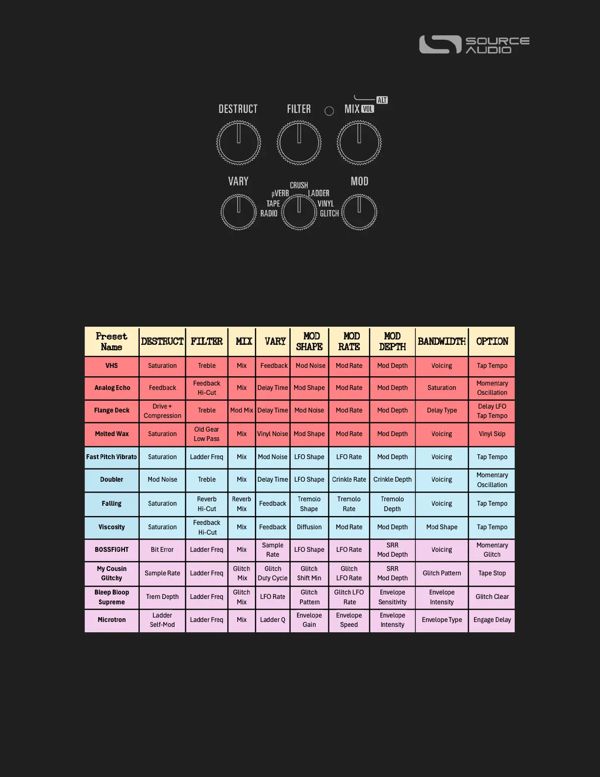 Below is a chart outlining what each variable control knob does for each Factory Preset.