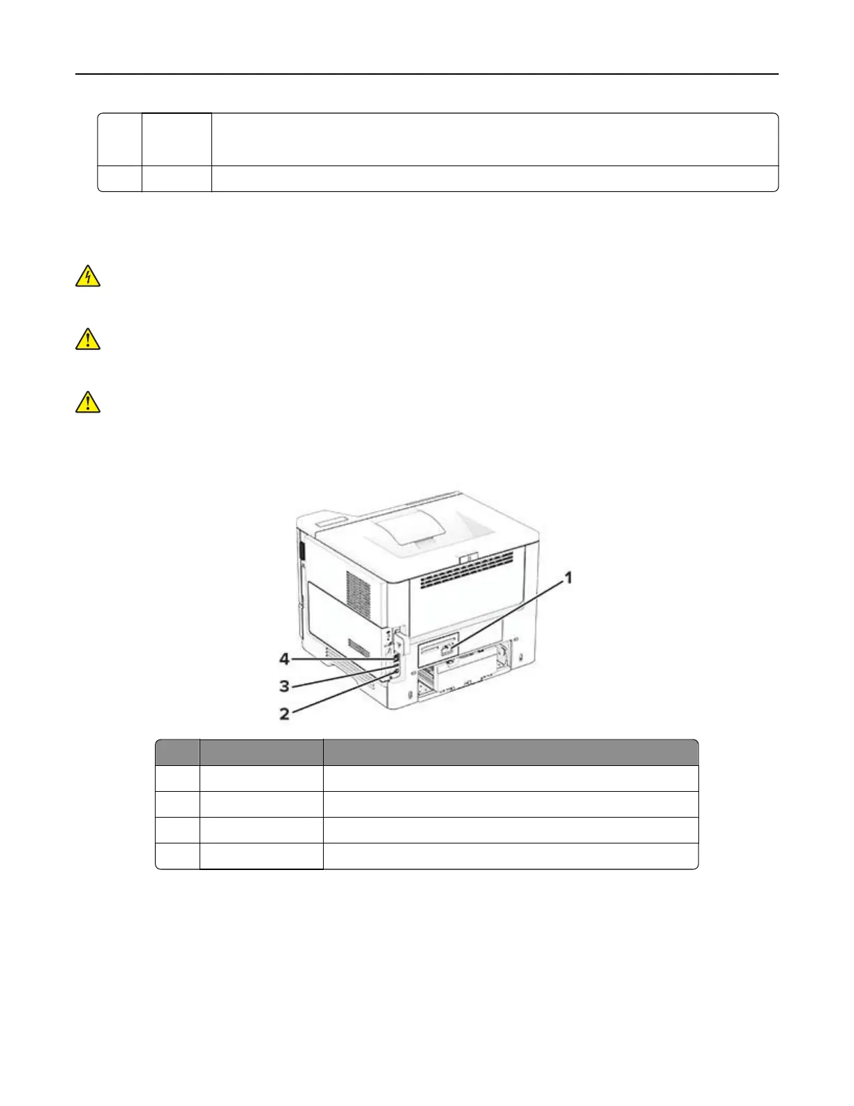 1 Power cord socket Connect the printer to a properly grounded electrical outlet.