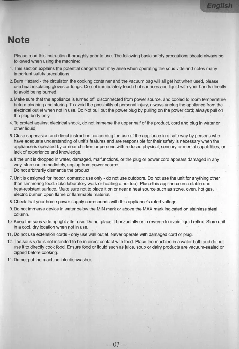 This section explains the potential dangers that may arise when operating the sous vide and notes many