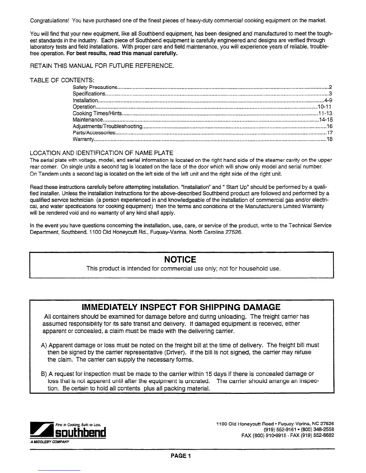 You will find that your new equipment, like all Southbend equipment, has been designed and manufactured to meet the tough-