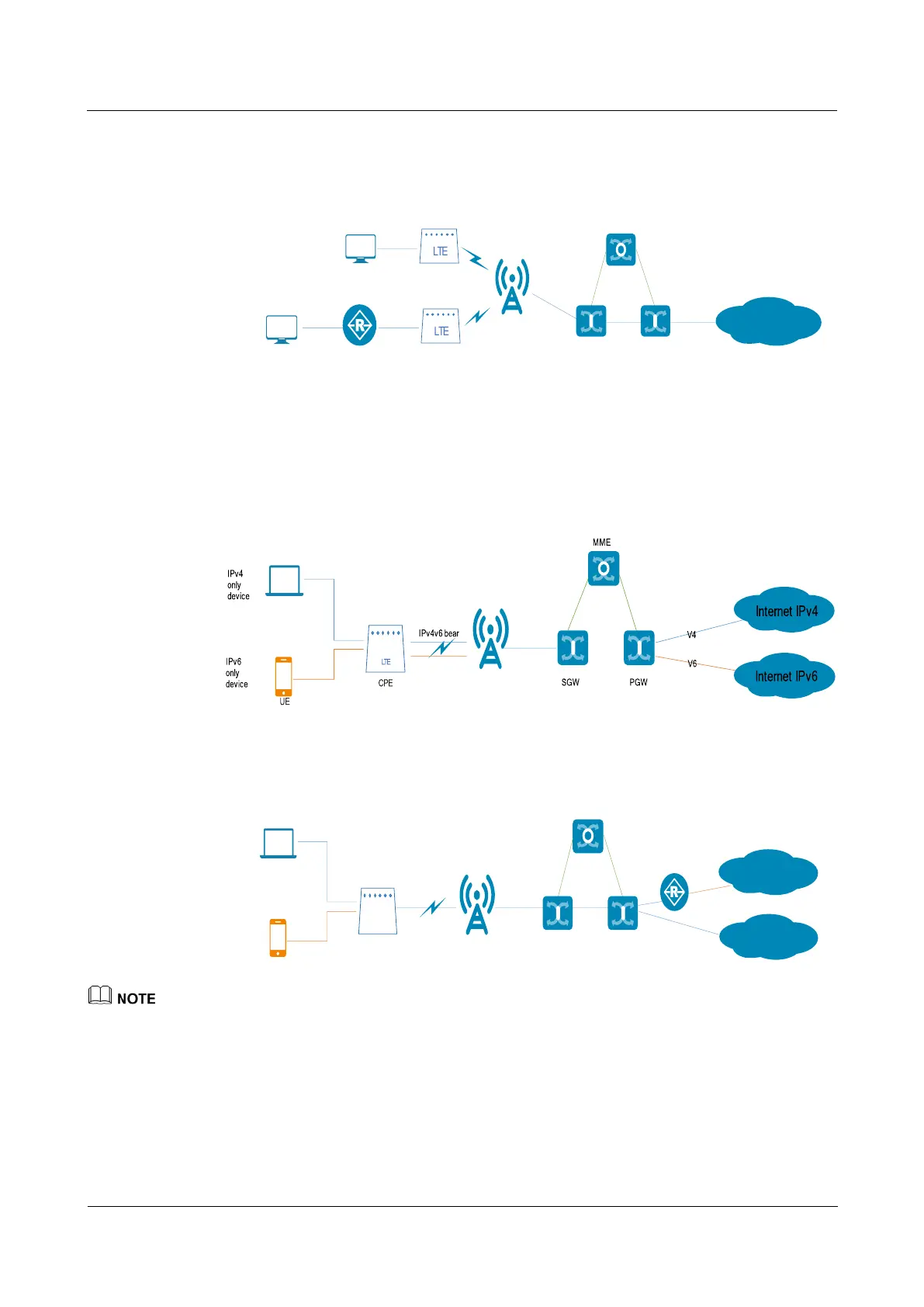 The LTE CPE supports IPv6 only with the transition solution CLAT for IPv4 device.