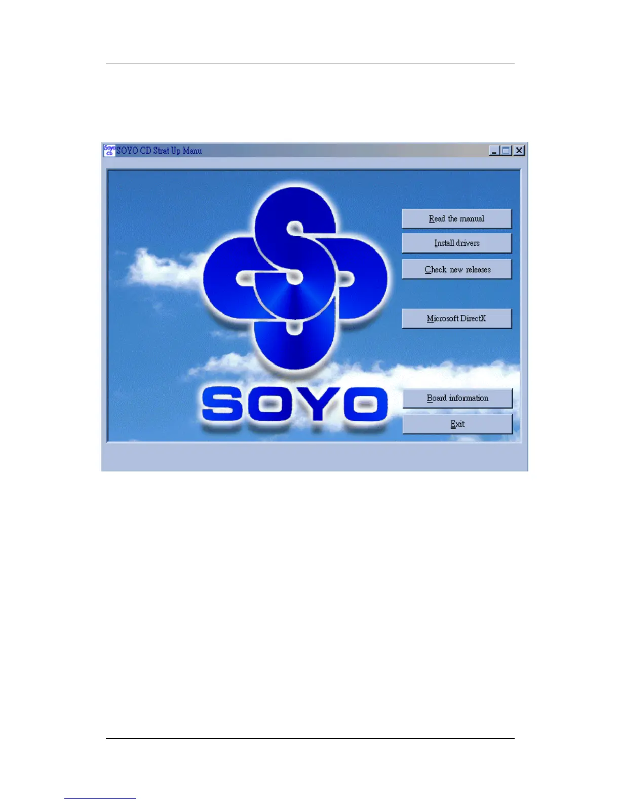 If you use Windows 95/98/ME, the SOYO CD Start Up Program