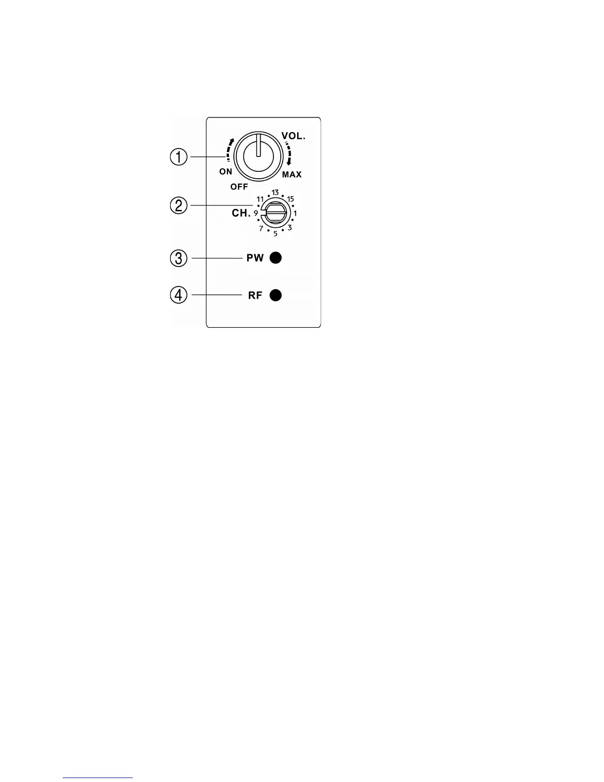 turn increases volume. Leave in the OFF position if not used. PW LED below