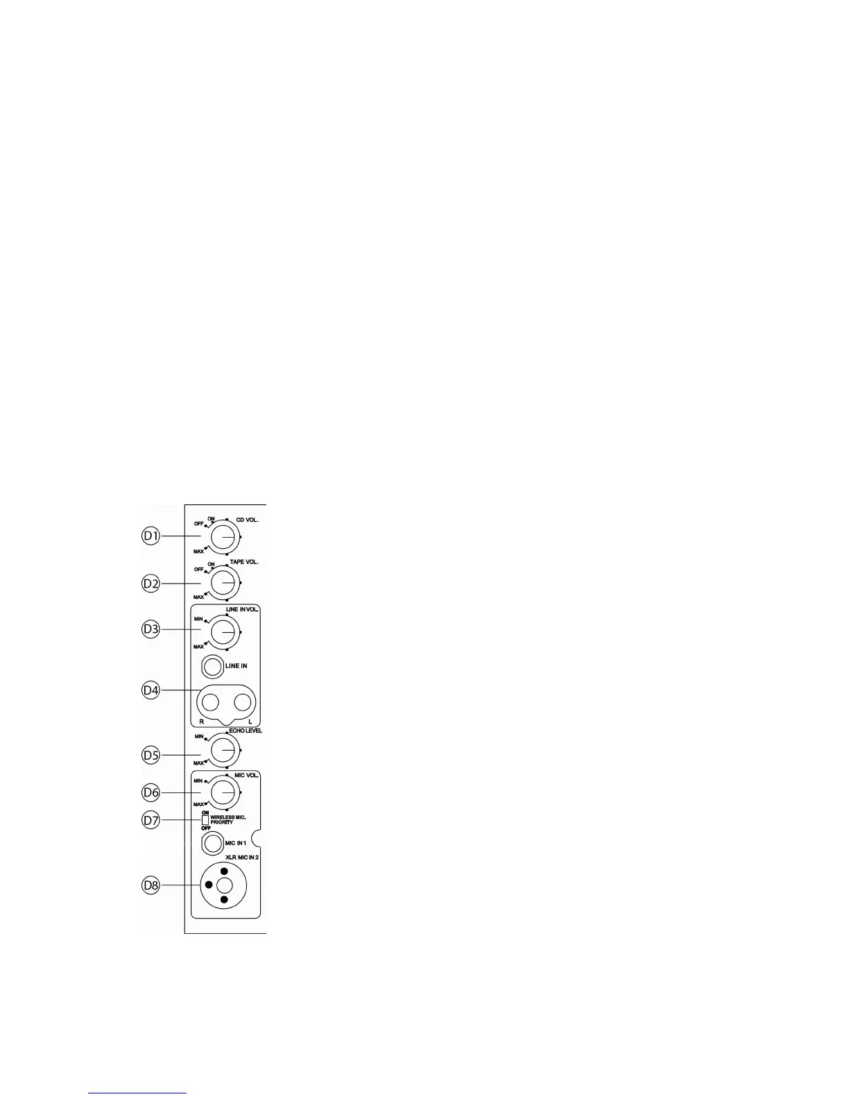 D3: LINE IN VOL – volume control for ¼ inch or RCA