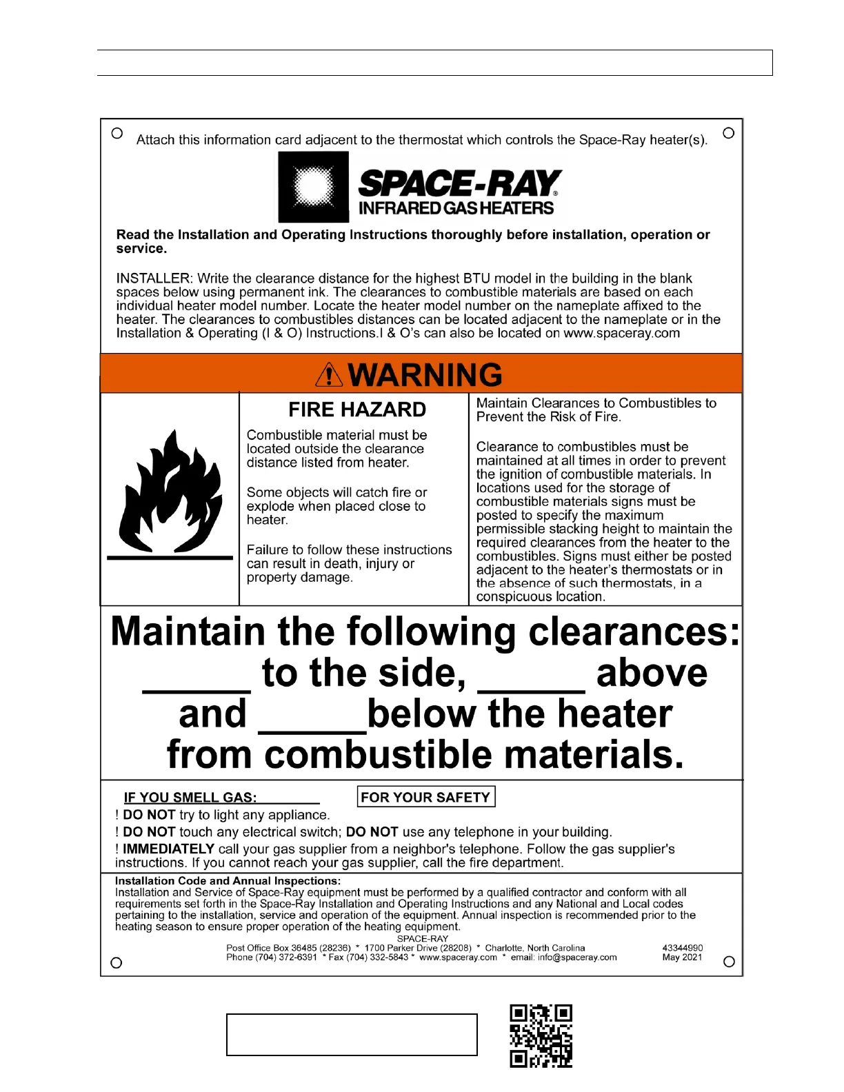 Copies of this card may be ordered at no charge under part no. 43344990 for installation near the heater.