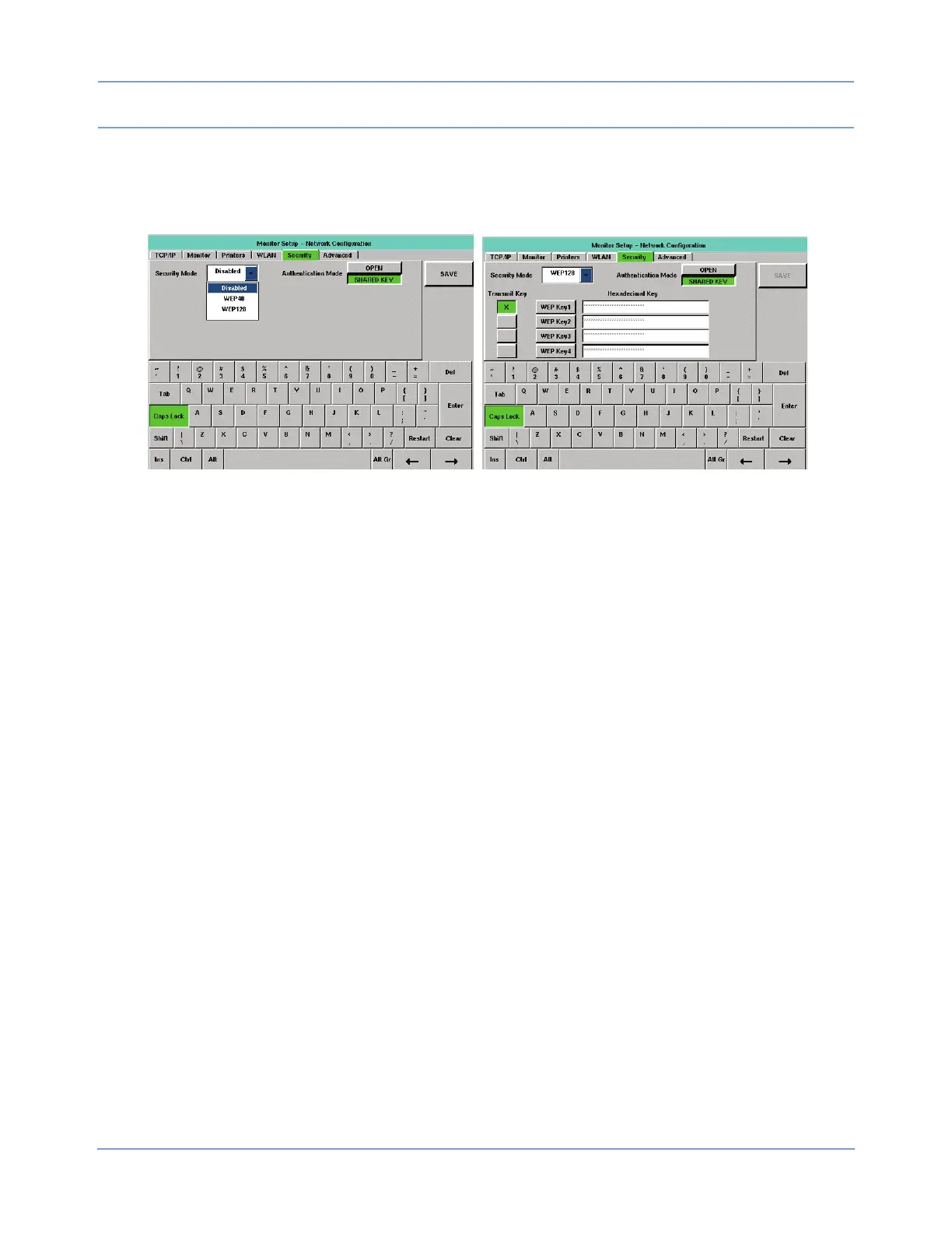 menu. In the right portion of Figure 2-15, Security Mode is set to WEP128, after entering hexadecimal keys.