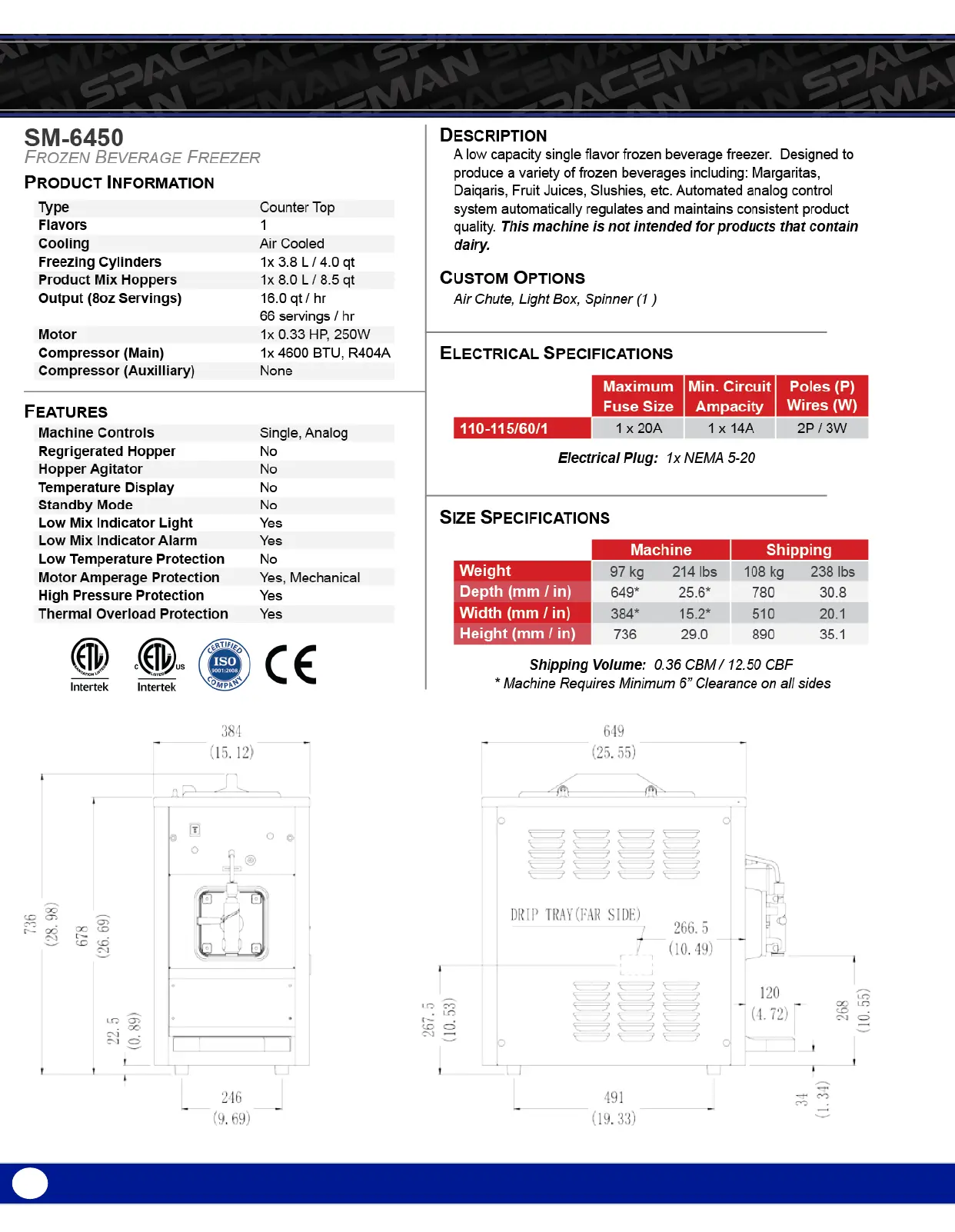 Spaceman SM-6450 - Machine Specifications; Product & Custom Options; Electrical & Size Specifications