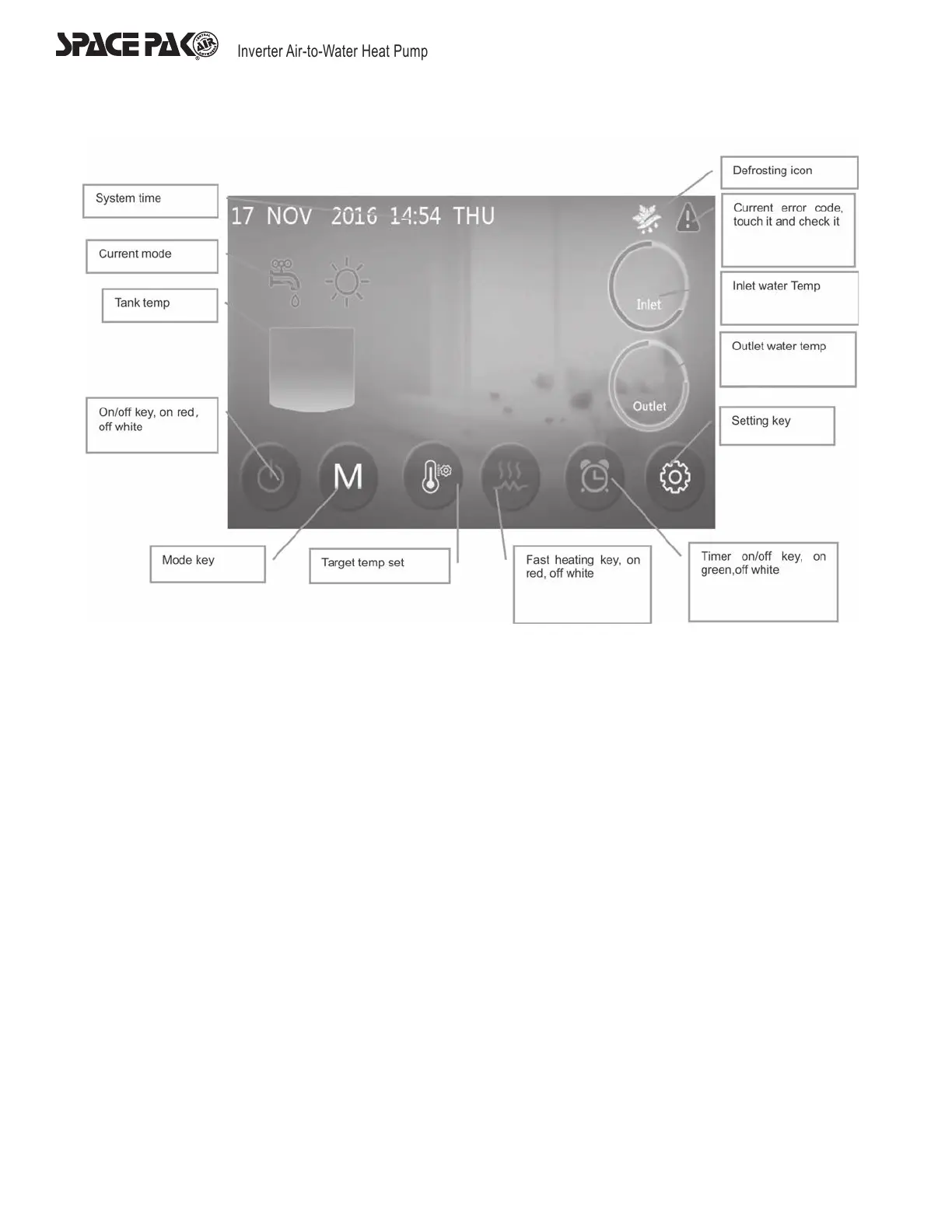 3. When the unit is shutdown, if the fast heating function is activated, the color of the button for ‘fast heating key’ is red, if not, the