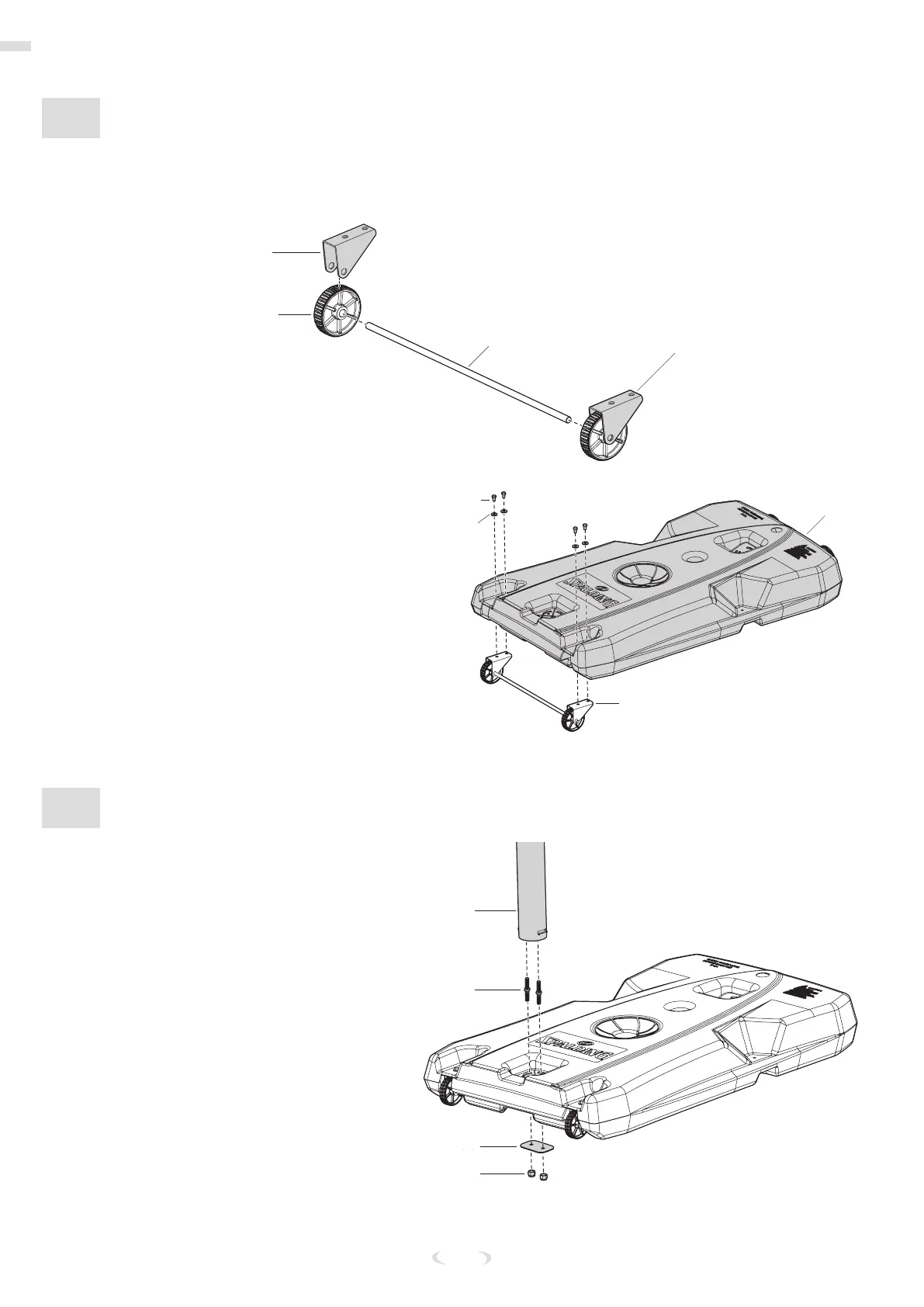 2. Introduzca el eje de las ruedas (2) a través de ambas ruedas (3) y soportes de las ruedas (19).