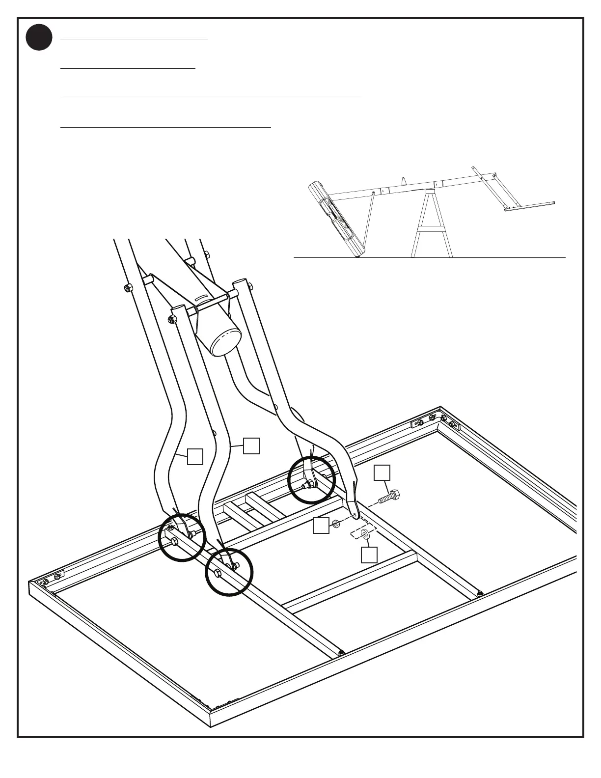 While still supported on sawhorse. Attach elevator tubes (32, 35) to backboard using spacers (30), bolts (23), and