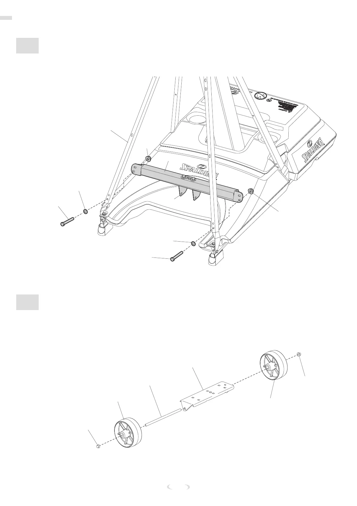 2. Secure the wheels (7) to the axle (14) using the push caps (W9).