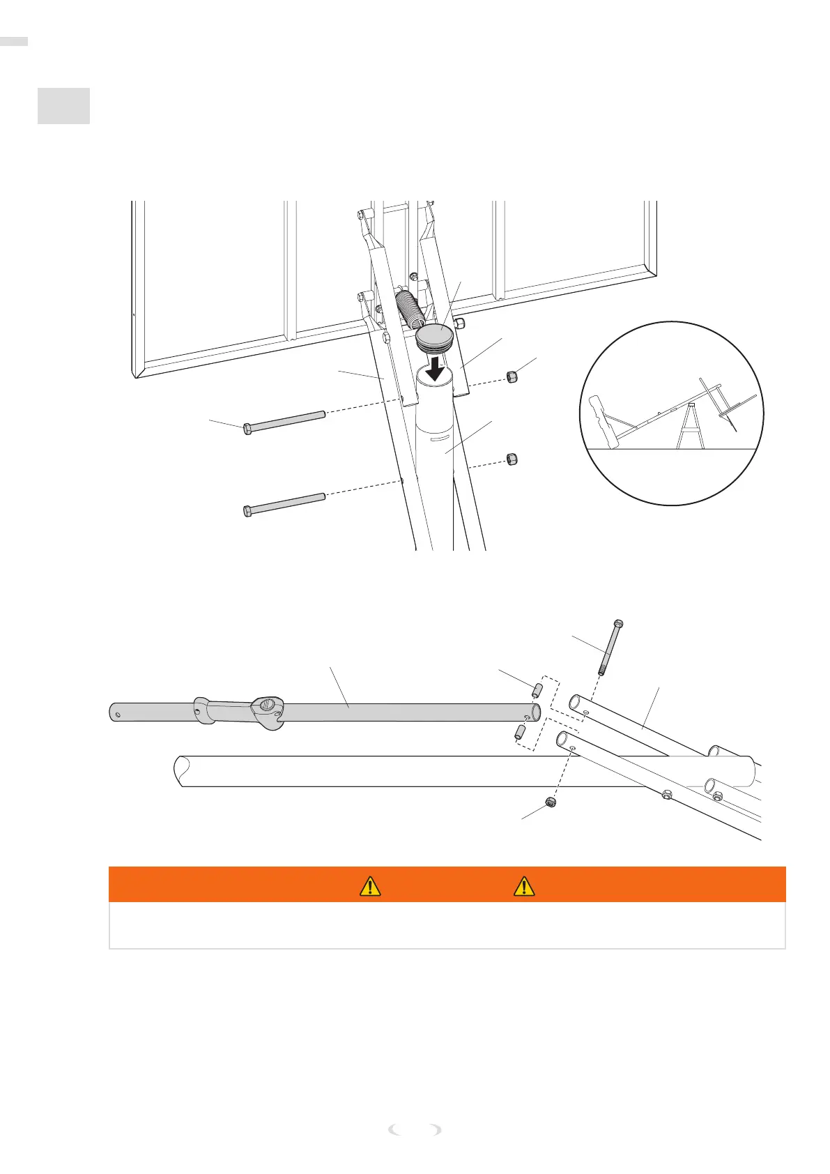5. Apoye el poste en el caballete. Fije los tubos superiores e inferiores del elevador (41 y 42) al poste