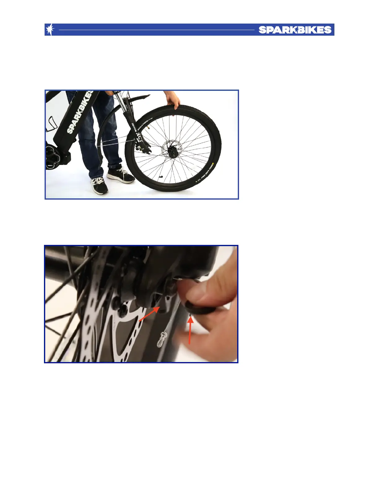 Insert the wheel into the fork hooks ensuring that the disc brake rotor is inserted into the