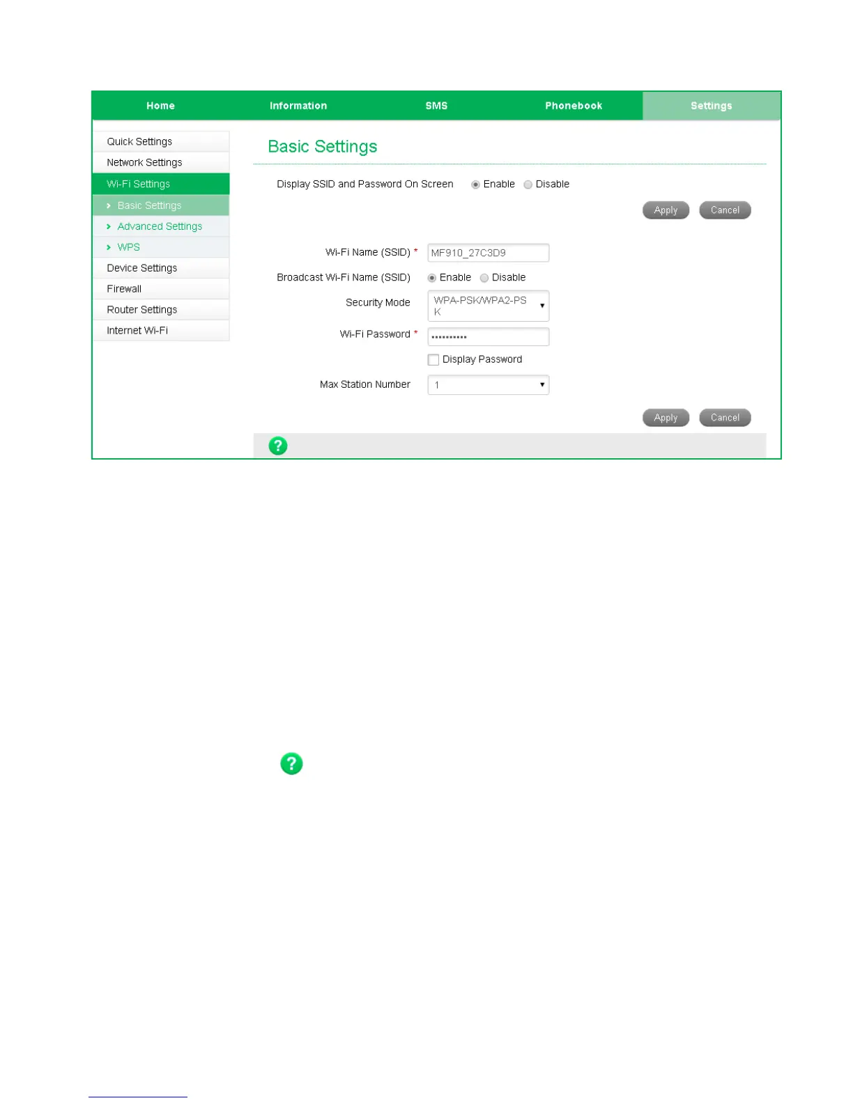 • By default the SSID and Password is shown on the front screen. Select Disable on