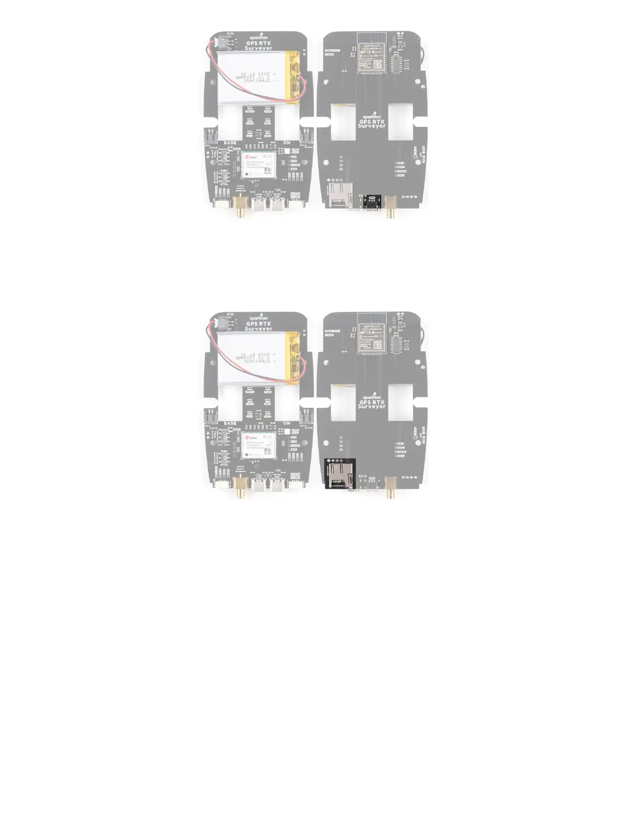 A microSD socket is situated on the ESP32 SPI bus. Any microSD up to 32GB is supported. RTK Surveyor