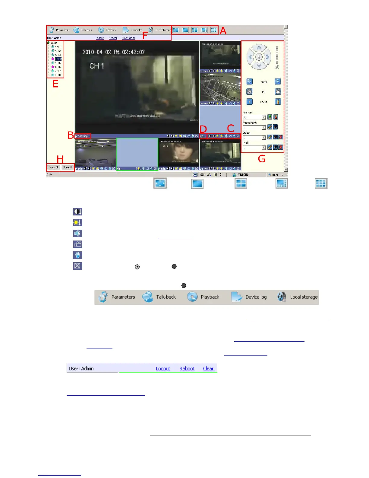 From left to right: Current Login Account, Log-out, Restart DVR remotely, Clear alarm