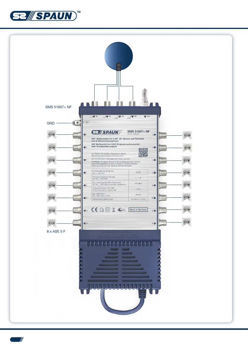 SPAUN SMS 5607+ NF - Application Diagram and Product Details; Multiswitch Connection Diagram; Product Labeling and Warnings