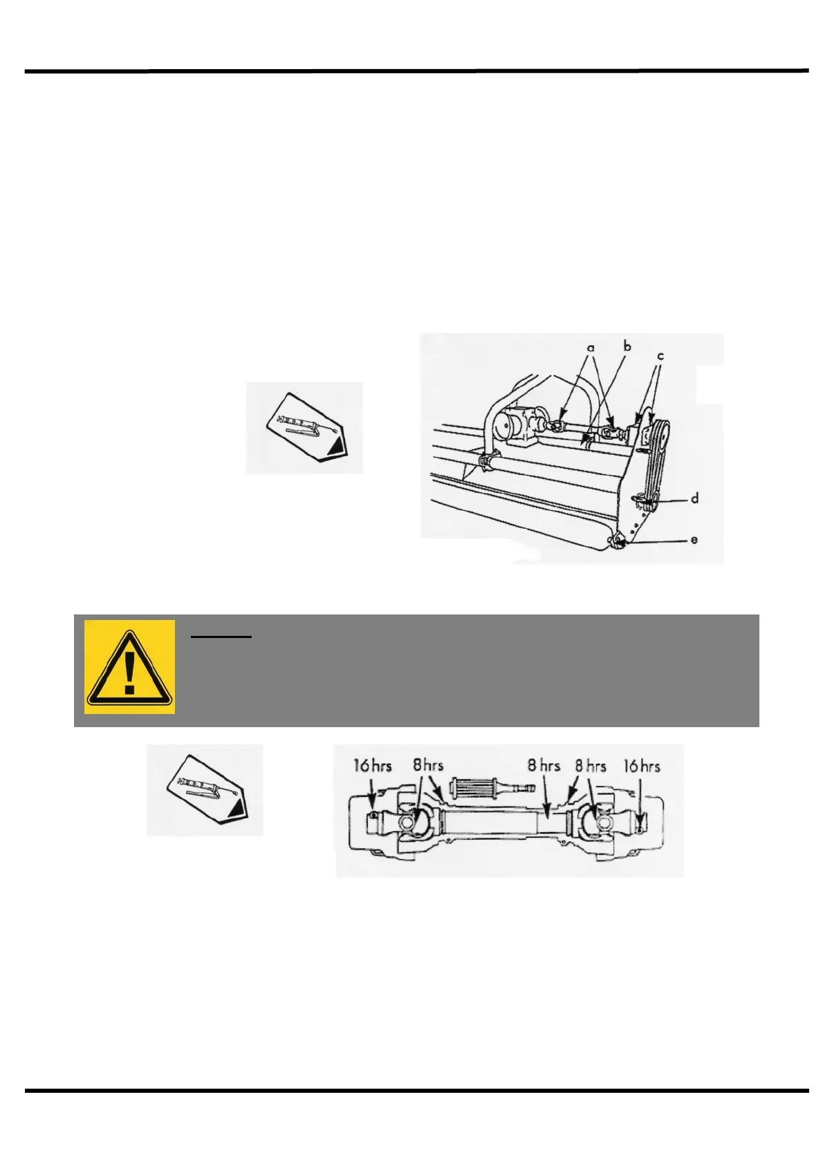 Dismantle and clean PTO sliding surfaces and re-grease universal joints.