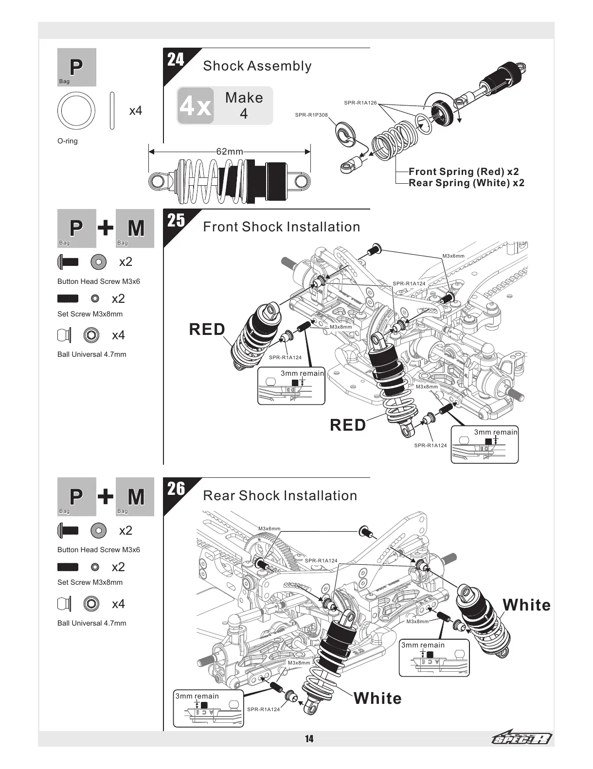 Spec-R S1 - 24 Shock Assembly; 25 Front Shock Installation; 26 Rear Shock Installation