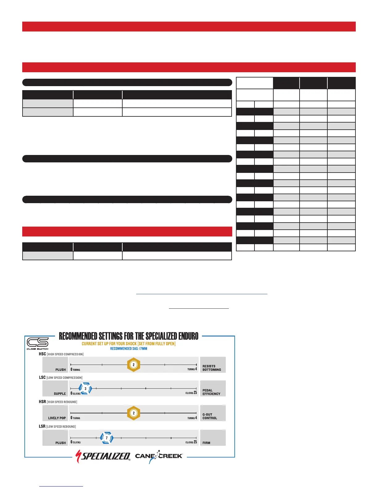Refer to the rebound/compression chart to set the rebound damping (red knob). Rebound