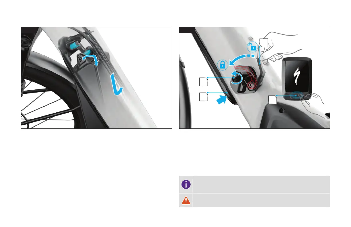 Lock the battery latch and remove the key from the frame (C). Do not ride the bicycle with