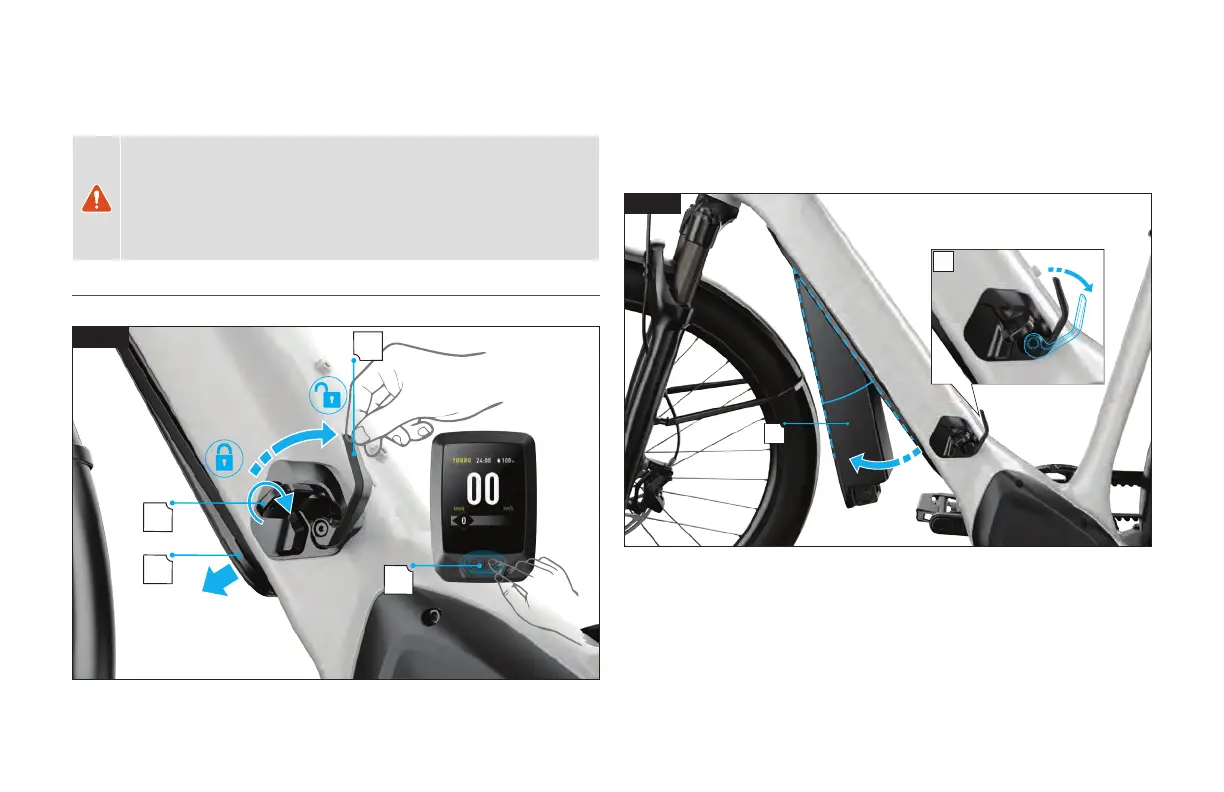 Tournez le levier du loquet dans le sens des aiguilles d’une montre (C) afin de libérer la batterie (D).