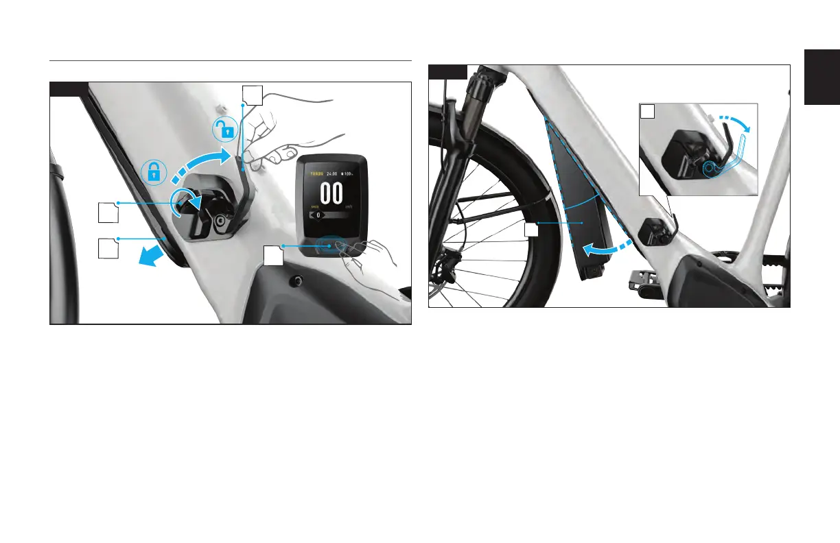 Rotate the latch lever clockwise (C) to release the battery (D).