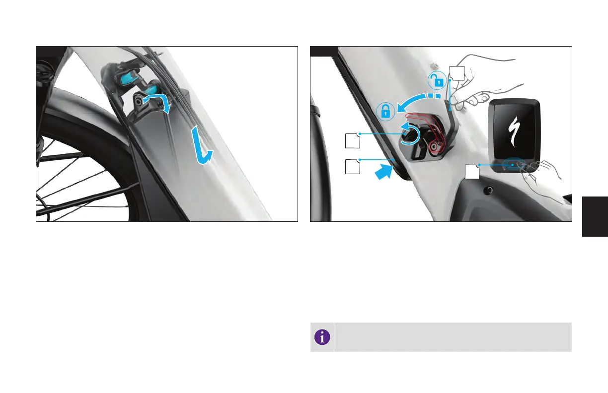 że akumulator jest zamocowany w ramie. Obróć dźwignię zatrzasku w kierunku