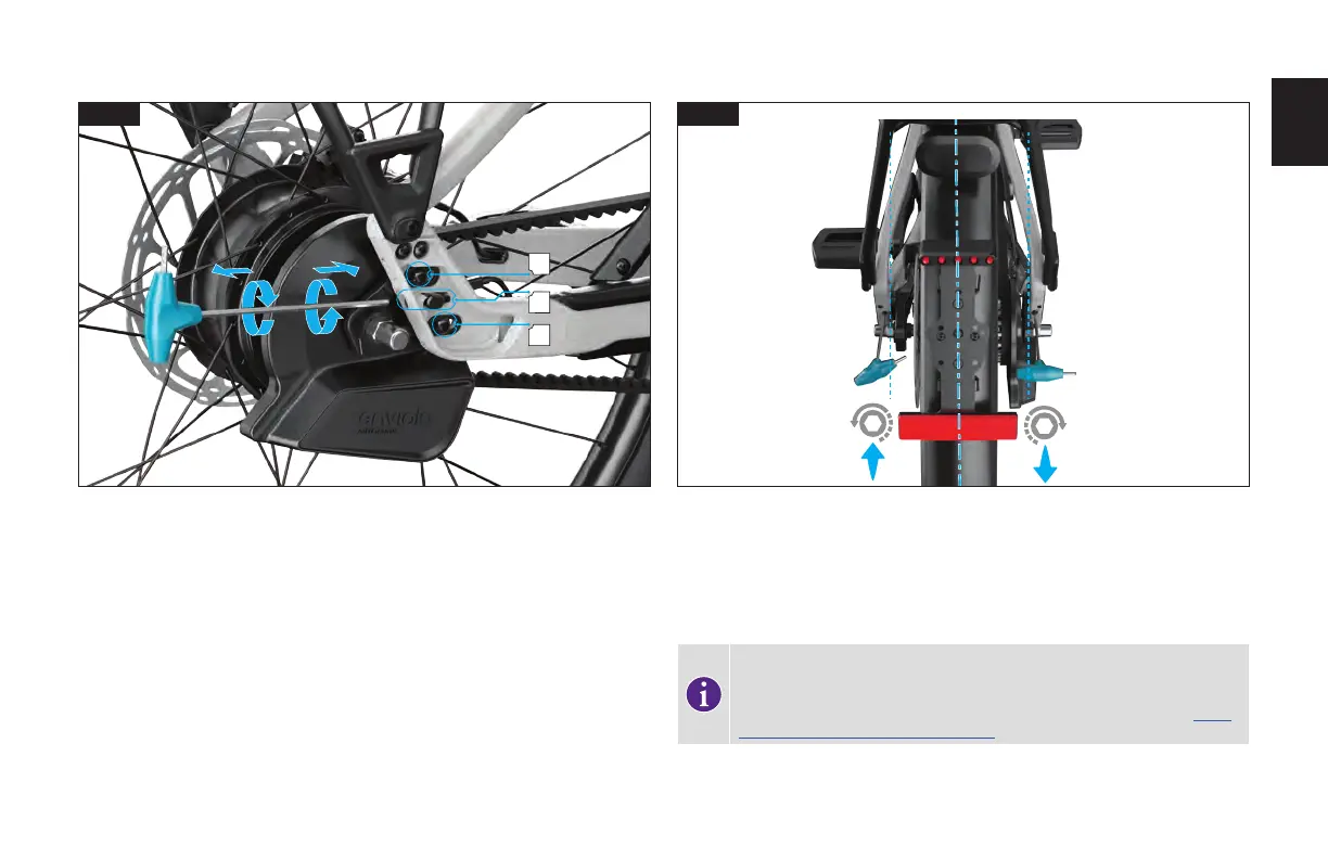 Starting on the drive side (right), use a 3 mm hex key to tighten or loosen the adjuster bolt