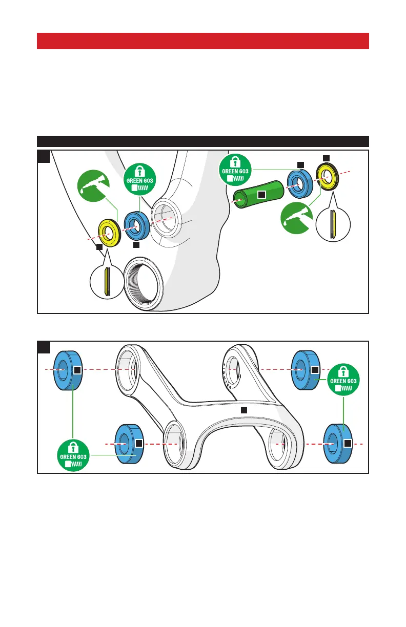 Apply the specified green Loctite to the bearings (D) and bearing bores, then press the bearings into the link (E).