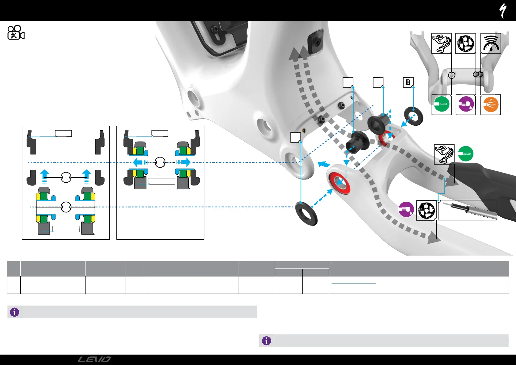 Place the spacers (B) against the bearings on the main pivot.