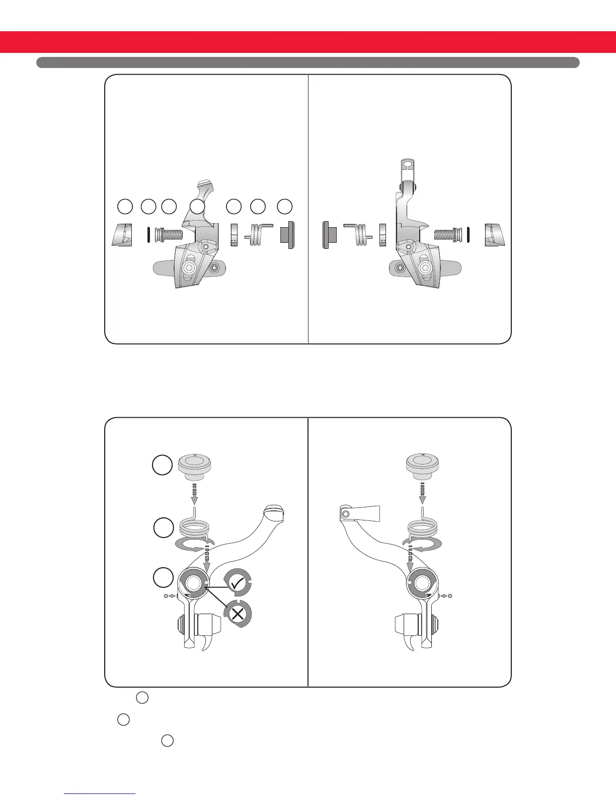 , clockwise for the drive-side brake, counter-clockwise for the non-drive-side brake. The shorter of the two spring pins goes in