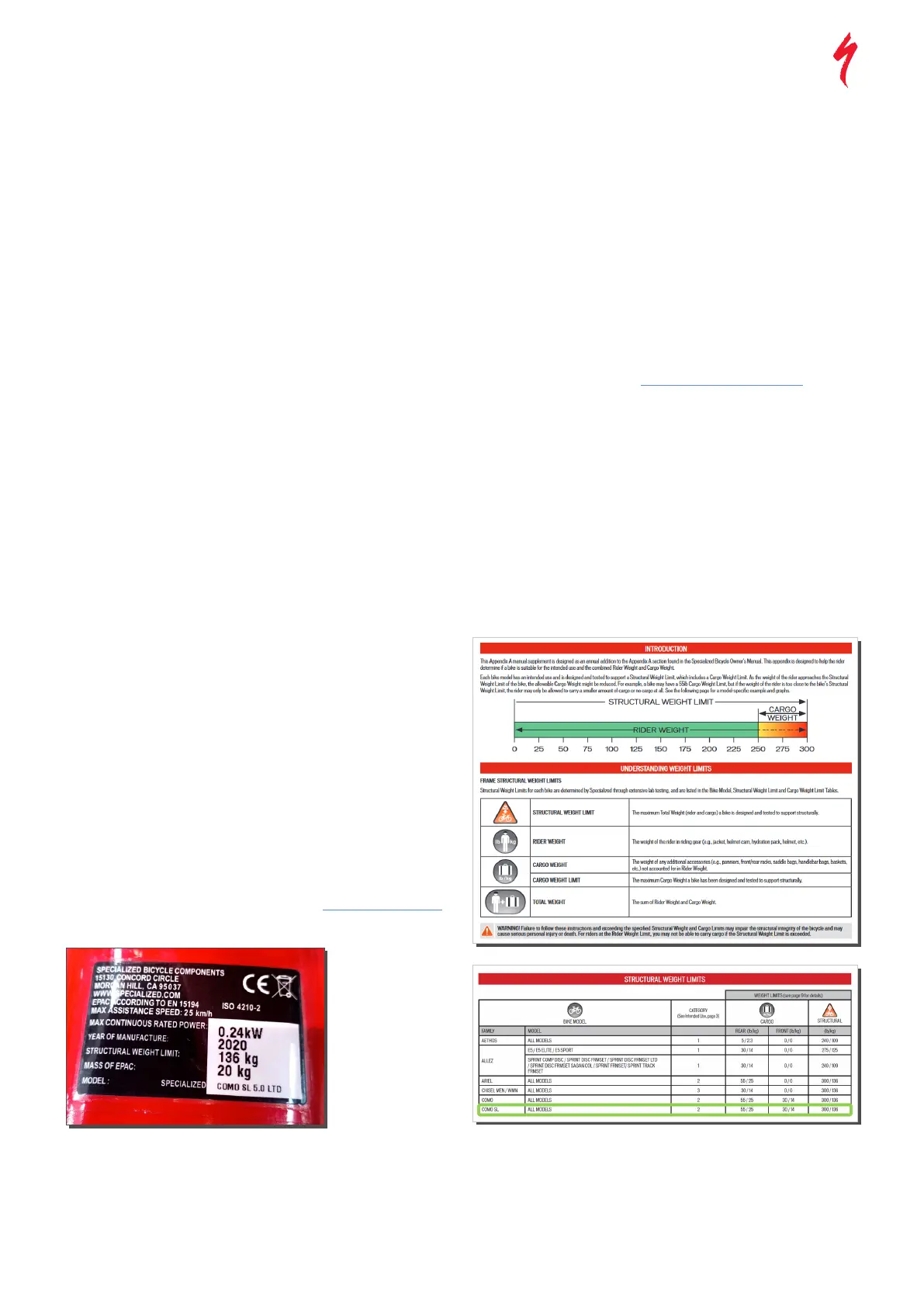 • The structural weight weight limit for Como SL bikes is