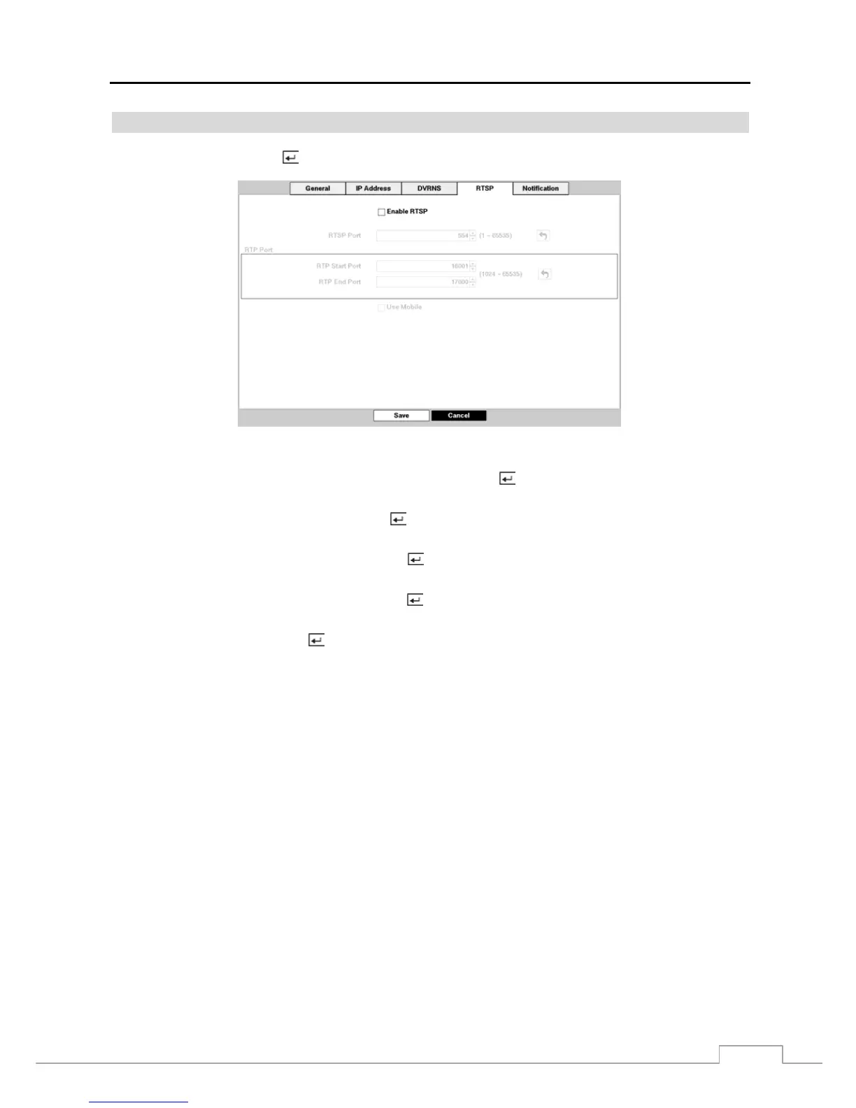Highlight the box beside RTSP Port and press the button. Set the port number of the RTSP server obtained from