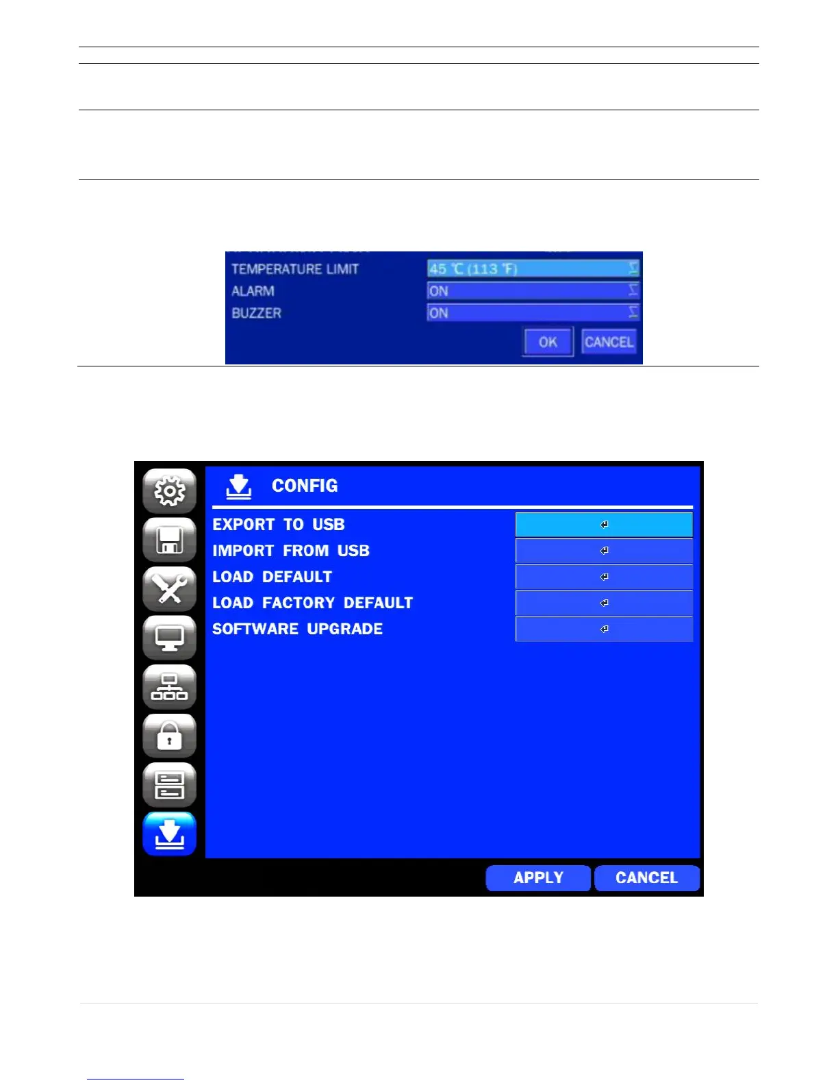 In the SETUP menu, select the CONFIG tab. Then, the configuration menu is displayed as pictured below.