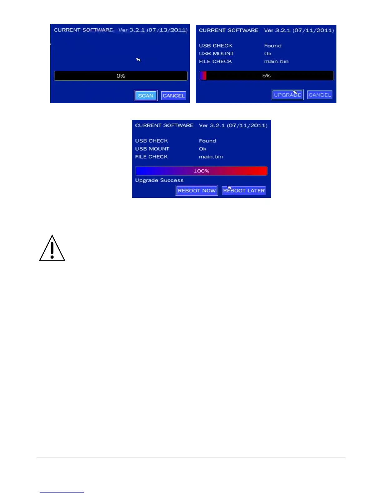 1. If selecting REBOOT LATER, the upgraded software will not be applied until the system