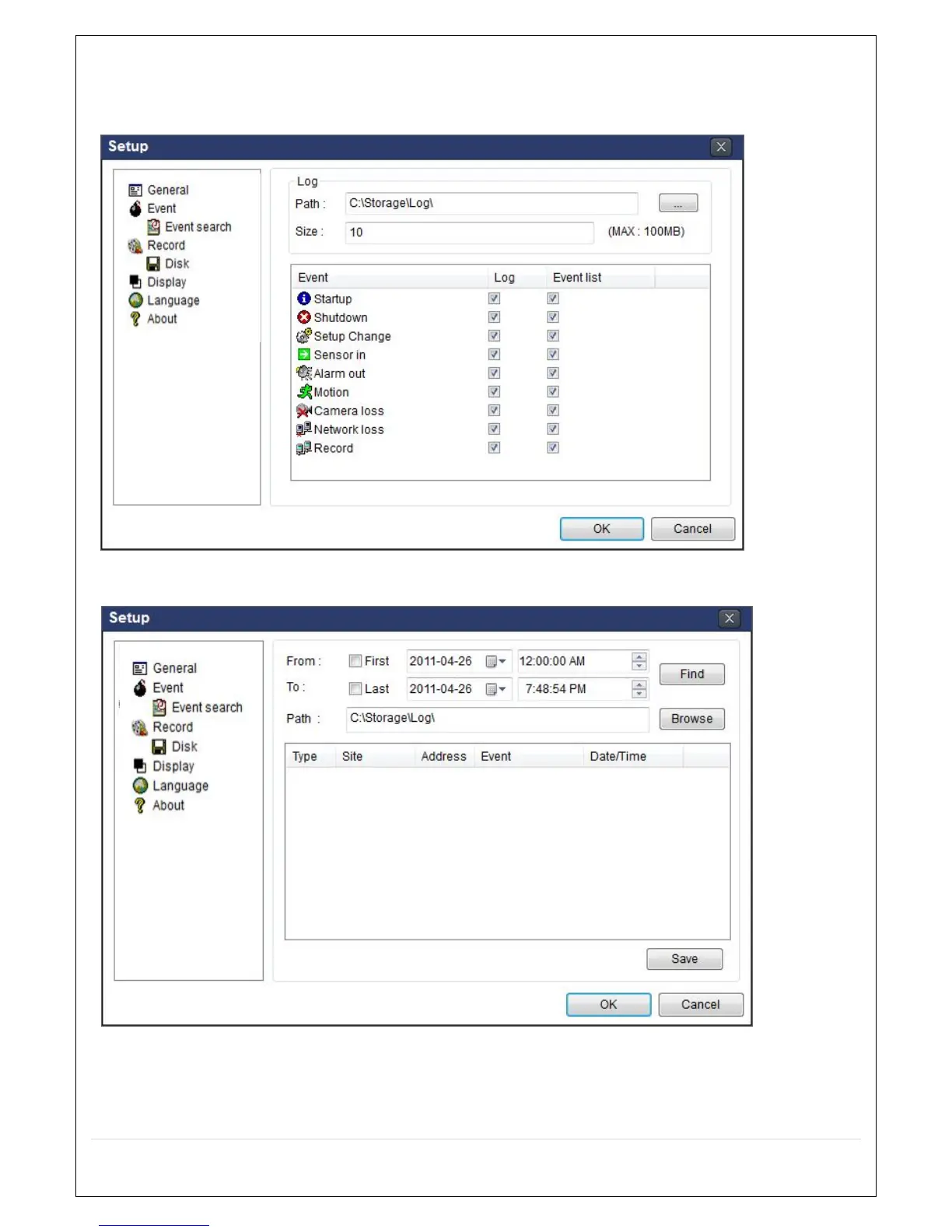 Event Search: Event log can be searched from the selected time.