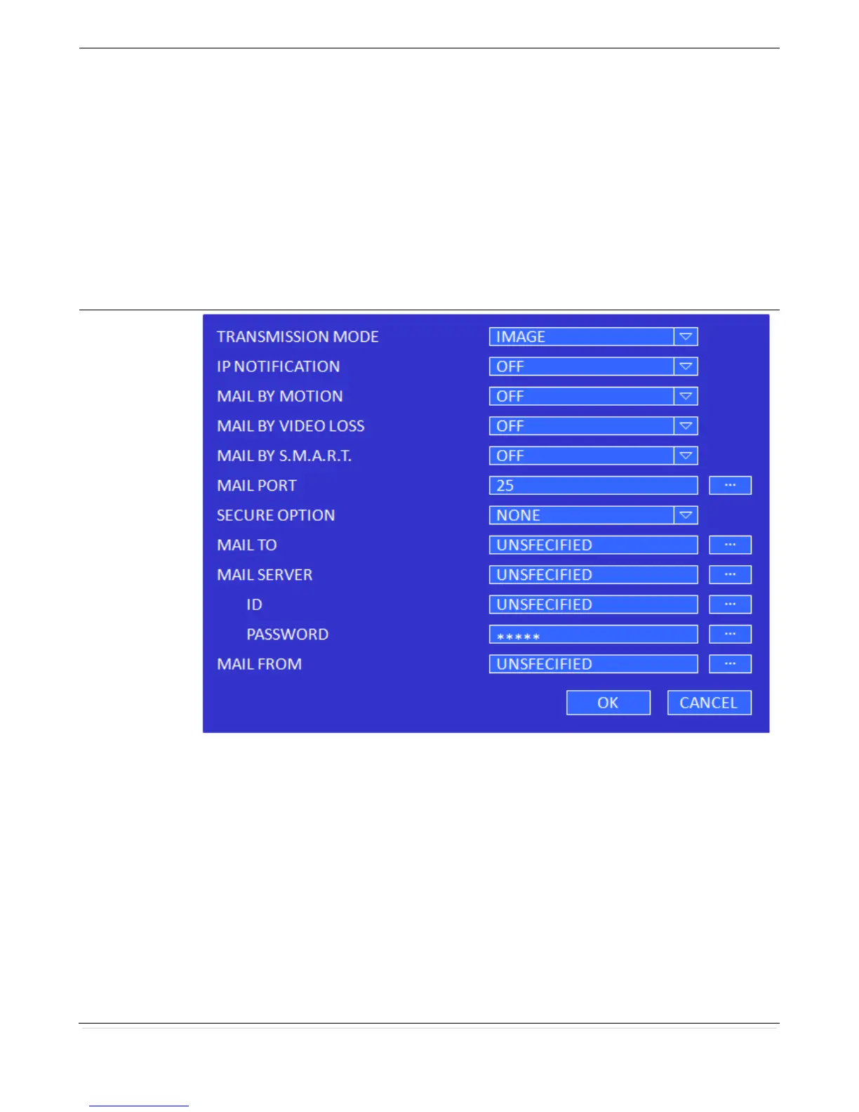 MAIL BY VIDEO LOSS: Enable/disable sending e-mail when the video loss is detected.