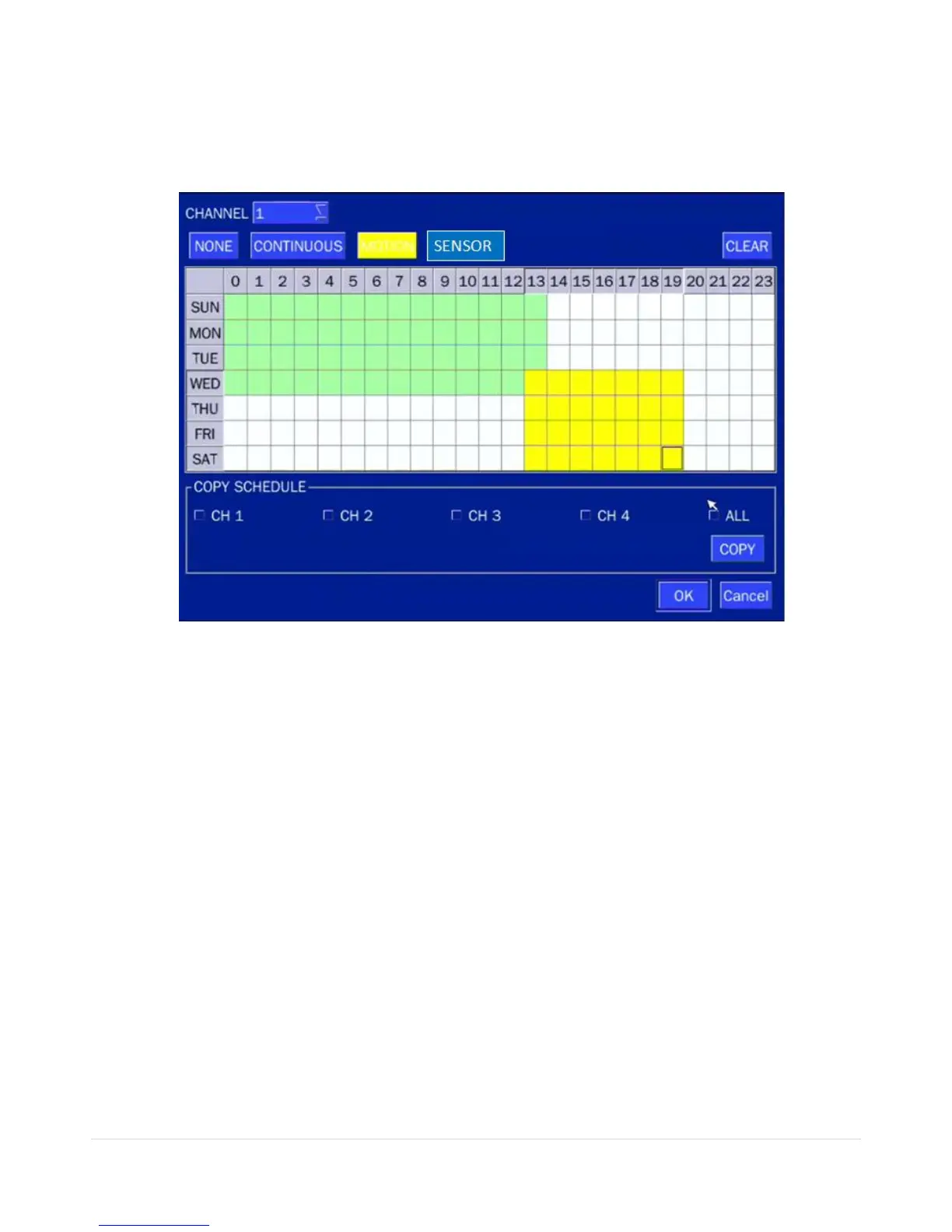 Select CHANNEL > select NONE, CONTINUOUS or MOTION > HIGHLIGHT AREA